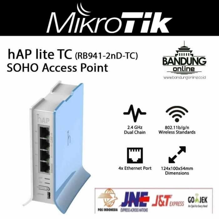 Mohon untuk menanyakan persediaan barang sebelum membeli. MIKROTIK RB941-2nD-TC - home Access Point lite (hAP Lite) GARANSI RESMI 1 TAHUN HIGHLIGHT amp; FITUR * Wireless Access Point Rumahan yang Sederhana. * Dapat di Power hanya dengan USB Port * Mempunyai 4 Port Ethernet * Ideal untuk Apartemen dan Rumah ataupun Kantor * Support WPS untuk security Wireless Anda. FUNGSI PRODUK Mikrotik RB941-2nD-TC adalah sebuah perangkat home Access Point lite (hAP lite) yang sangat ideal untuk apartemen, rumah atau Kantor Anda. Support tombol WPS triger untuk kenyamanan Anda tanpa harus secara sulit mengetikan password setiap orang yang ingin konek ke wireless internet access, dan dapat juga difungsikan menjadi mode cAP dan Join ke sebuah CAPsMAN secara sentralisasi network di-manage dengan Tombol Push. Tentu juga Perangkat ini dilengkapi dengan RouterOS dengan fiturnya seperti Bandwidth shaping, Firewall, User Access Control , dan lain sebagainya. SPESIFIKASI PRODUK Kode Produk: RB941-2nD-TC CPU Nominal Frequency: 650 MHz CPU core count: 1 RAM: 32 MB 10/100 Ethernet ports: 4 Wireless standards: 802.11b/g/n Wireless chip model: QCA9533 Supported input voltage: 5 V - 5 V License level: 4 Antenna gain dBi: 1.5 CPU: QCA9533 Max Power consumption: 3W Number of chains: 2 Storage type: FLASH Storage size: 16MB Wireless Frekuensi: 2.4 GHz ISI KEMASAN / PAKET * Mikrotik RB941-2nD-TC * Quick Installation Guide