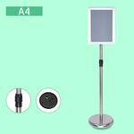 Parameter produk ● Bahan: Baja Tahan Karat, PVC ● Warna: perak, hitam, emas ● Ukuran bingkai: 32.5 * 45cm ● Ukuran poster yang berlaku: 29.7 * 42cm ● Ketinggian dudukan yang dapat disesuaikan: 87-133cm ● Diameter sasis: 25cm ● Berat: 2.5kg