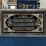 Hiasan Dinding Kaligrafi Ayat Kursi Ukuran Produk 52x92cm Kaligrafi terbuat dari lilin tembak dengan dasaran kain Bludru, pengerjaan Handmade. Frame berbahan Fiber anti air dan rayap, tahan lama tentu nya. Bagian depan menggunakan Kaca
