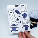 JUJUTSU KAISEN STICKER SHEETS available characters : Gojo Satoru Toge Inumaki Itadori Yuuji •material : vinyl matte (waterproof) •laminated : glitter •size : A6 mind you this batch is in limited stock and might be no restock after that! so make yourself unique! more design is coming soon ~