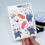 JUJUTSU KAISEN STICKER SHEETS available characters : Gojo Satoru Toge Inumaki Itadori Yuuji •material : vinyl matte (waterproof) •laminated : glitter •size : A6 mind you this batch is in limited stock and might be no restock after that! so make yourself unique! more design is coming soon ~