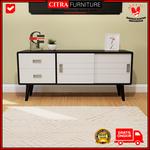 Sistem Pintu Geser (Sliding): Dilengkapi dengan pintu geser yang praktis dan hemat ruang, memberikan kemudahan akses ke kompartemen penyimpanan utama dengan tampilan garis horizontal yang artistik. Penyimpanan Terorganisir: Memiliki 2 laci tarik di sisi kiri dengan handle minimalis, sangat cocok untuk menyimpan dokumen, remote, atau aksesori media agar tetap rapi.