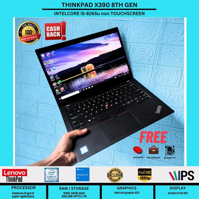 Lenovo Thinkpad X390 8th generation Processor Intel Whiskylake Core i5-8365U 8CPUS 1,90 Ghz Boost up to 3,6Ghz. Ram 16GB DDR4 ON BOARD SSD 256GB/512GB NVME SUPER FAST BOOT Vga Intel UHD grapich pro 620 4GB Webcam Eye crystal Super bening 12,6inch Panel LED wide screen HD 1366 x 768 layar bening no dead pixels Windows 10 Pro Recovery aktif ORIGINAL SUPER SPEED KILLER WIFI USB 3.1 Lebih Cepat dari usb 3.0 Battery 4/5 Jam istimewa Kondisi 90% Muluuus garansi personal 1 bulan spesial