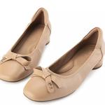 - Sepatu heels bernuansa monokrom dengan detail bow yang chic