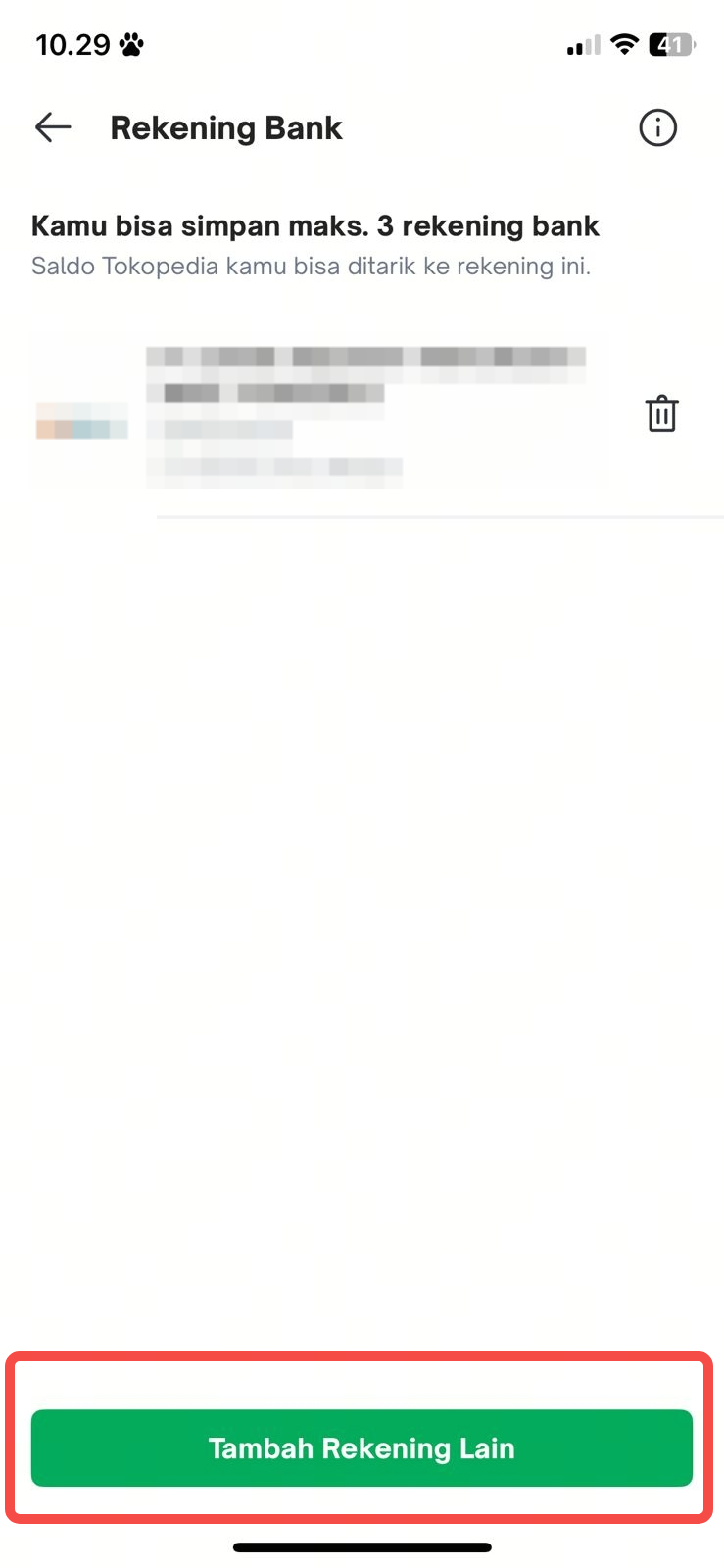 Toppers dapat menambah rekening bank di akun Tokopedia. Rekening bank di akun Tokopedia dapat digunakan untuk pemindahan saldo ke rekening bank kamu sehingga dapat dilakukan penarikan tunai.