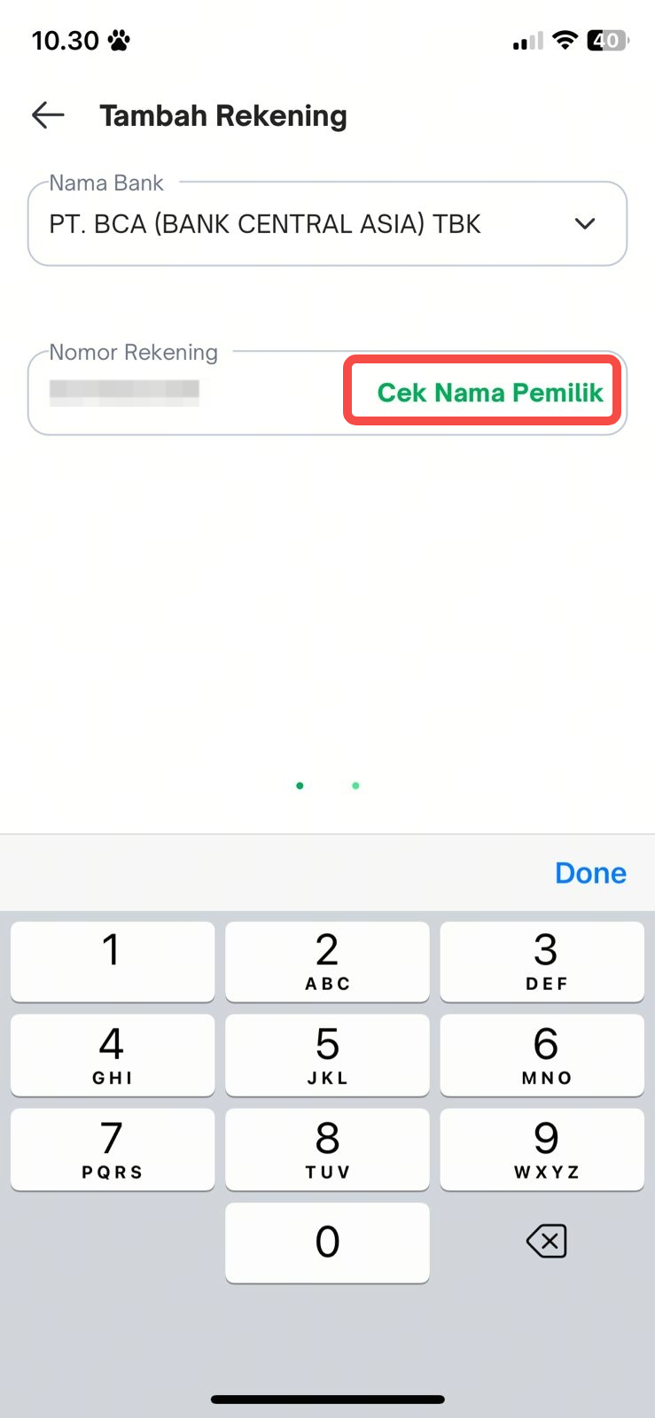 - Masukkan nomor rekening, kemudian klik "Cek Pemilik Rekening"