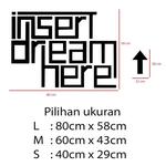 Selamat datang di toko kami selamat berbelanja Punya desain sendiri? Silahkan chat kami! Kirimkan desain amp; ukuran yang anda inginkan Kami memproduksi sendiri stikernya, produk di etalase selalu ready Stiker kami bisa di tempel pada tembok, dinding, kaca, dan semua permukaan datar seperti misalnya pada laptop, kulkas, dll. Bahan : Oracal Vinyl Matte/Doff 651 made in Germany. Outdoor tahan 5 tahun untuk black/white, 4 tahun untuk transparent / coloured / metallic Produk : Cutting sticker dimana bagian ber membentuk pola stiker dan bolong untuk backgroundnya atau bagian yang tidak ber Cara Pasang: Silahkan nonton video di atas Mohon tidak memberikan ulasan negatif sebelum komplain selesai dan tertangani dengan baik Keterangan Produk Desain : Insert Dream Here Ukuran : Lihat gambar ada ukuran produk Pilihan Warna : Hitam / Putih / Merah / Kuning / Biru / Hijau / Pink dan masih banyak lagi bisa di infokan melalui chat Pengiriman tiap Senin-Sabtu sore. Minggu amp; tanggal merah libur. Terima kasih selamat berbelanja, jangan ragu chat kami jika ada yang kurang jelas. Terimakasih sudah belanja di toko kami jangan lupa ulasan dan bintangnya Jika barang bisa di klik berarti ready