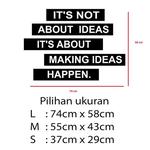 Selamat datang di toko kami selamat berbelanja Punya desain sendiri? Silahkan chat kami! Kirimkan desain amp; ukuran yang anda inginkan Kami memproduksi sendiri stikernya, produk di etalase selalu ready Stiker kami bisa di tempel pada tembok, dinding, kaca, dan semua permukaan datar seperti misalnya pada laptop, kulkas, dll. Bahan : Oracal Vinyl Matte/Doff 651 made in Germany. Outdoor tahan 5 tahun untuk black/white, 4 tahun untuk transparent / coloured / metallic Produk : Cutting sticker dimana bagian ber membentuk pola stiker dan bolong untuk backgroundnya atau bagian yang tidak ber Cara Pasang: Silahkan nonton video di atas Mohon tidak memberikan ulasan negatif sebelum komplain selesai dan tertangani dengan baik Keterangan Produk Desain : It #39;s Not About Ideas, It #39;s About Making Ideas Happen Ukuran : Lihat gambar ada ukuran produk Pilihan Warna : Hitam / Putih / Merah / Kuning / Biru / Hijau / Pink dan masih banyak lagi bisa di infokan melalui chat Pengiriman tiap Senin-Sabtu sore. Minggu amp; tanggal merah libur. Terima kasih selamat berbelanja, jangan ragu chat kami jika ada yang kurang jelas. Terimakasih sudah belanja di toko kami jangan lupa ulasan dan bintangnya Jika barang bisa di klik berarti ready