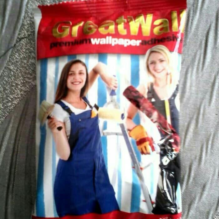 Lem Wallpaper Dinding Great Wall merupakan lem kualitas bgs dan tidak merusak dinding. 1 (satu) Bungkus lem cukup untuk 6 roll wallpaper ukuran 5m2 Cara membuat Lem Wallpaper : 1. Untuk penggunaan pada wallpaper berat, campurkan 1 bungkus lem serbuk (125 gram) dengan air 8 Liter. Pemakaian untuk luas pasang 45 m2 2.Taburkan serbuk lem sedikit demi sedikit ke dalam ember yang berisi air sambil diaduk dengan cepat menggunakan kuas atau gagang kayu. Setelah itu, adonan lem diaduk hingga tercampur dengan baik dan mengental. 3.Untuk membuat adonan lem yang kental, kurangi campuran airnya, demikian sebaliknya jika menginginkan adonan lem yang sedikit encer, maka tambahkan sedikit campuran airnya. 4.Setelah adonan lem tercampur rata, biarkanlah selama 10 menit sebelum lem tersebut digunakan. Lem yang kuat, lama, dan ramah lingkungan tersebut dapat digunakan untuk semua bahan wallpaper dinding maupun border wallpaper. 5.Aplikasikan larutan lem tersebut pada bagian belakang wallpaper dengan menggunakan kuas cat. Anda dapat menggunakan roll cat agar larutan lem tersebar cepat dan merata pada permukaan belakang wallpaper dinding tersebut. 6.Dalam satu hari umumnya lem wallpaper ini sudah mengering dan benar-benar sempurna merekatkan kertas wallpaper dengan bidang tembok. Jika lem wallpaper meluber dan menempel pada kusen jendela atau pintu atau menetes di lantai, maka segeralah hapus/ bersihkan sisa-lem tersebut dengan kain kering.