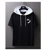 hoodie lengan pendek kaos topi big size all size atasan pria wanita - HITAM HD PUTIH, S