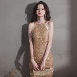 Source: China Product category: small dress Color: champagne gold fls-321, blue fls-321, wine red fls-9907 Size: S, M, L, XL, XXL Dress Type: Slim Fit Popular elements: solid color Wedding style: collar Skirt length: short skirt Waist type: mid-waist Clothing style details: beads, nails